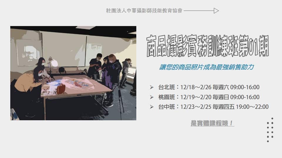 27 3 月, 2026/通過: PeggyIn外部公告, 最新消息, 課程訓練 標籤:所有課程, 政府補助80%, 最新消息, 活動課程, 社團法人中華攝影師技能教育協會, 講座分享168474 商品攝影與AI輔助應用班第01期- 板橋