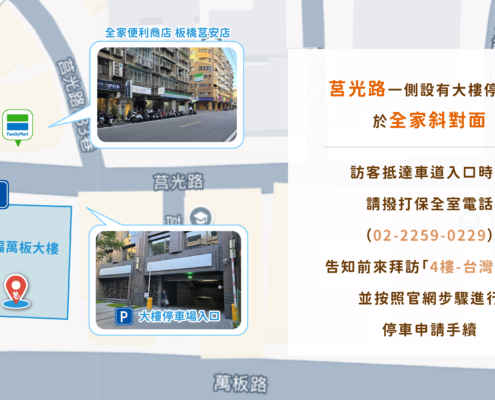 訪客抵達車道入口時,請撥打保全室電話(02-2259-0229),告知前來拜訪「4樓-TCCC」。保全將指定臨時停車位號碼,並引導後續流程: