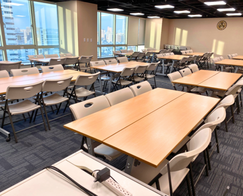 - 機動式摺疊訓練桌,隨時根據授課內容輕鬆調整排列組合。人體工學座椅,提供學員舒適的支撐座椅。