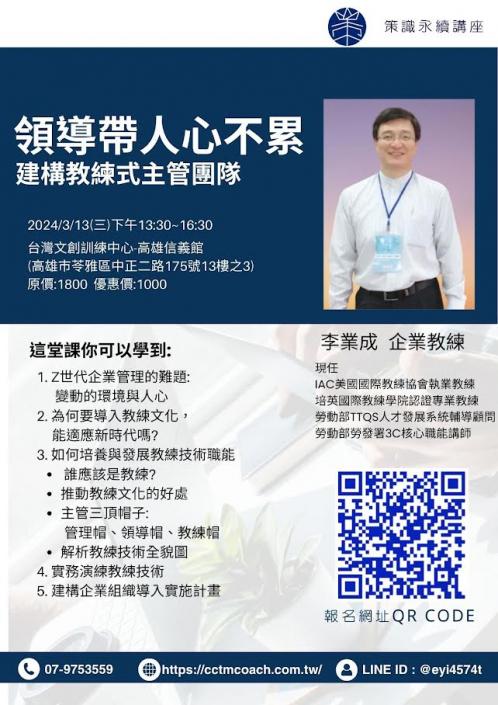 - 導入教練文化以應對新時代挑戰:探討如何通過教練方法提升管理效能,並使其成為企業文化的一部分。