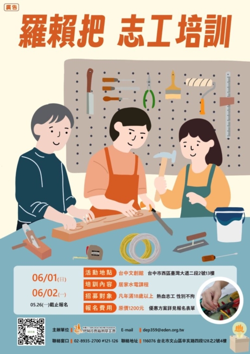 伊甸基金會自民國107年開辦「羅賴把活力工程」,為了協助獨居長者、弱勢家庭及身障人士等打造無障礙住宅,本會舉辦多場居家修繕相關培訓課程,培育多數羅賴把志工,更有堅強的師資團隊。