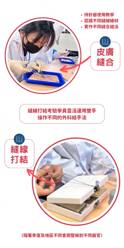 透過真實的皮膚縫合與解剖實作,讓學員親身體驗醫學技術的細膩與專業,培養動手能力與觀察力。 - 建立學習歷程亮點: