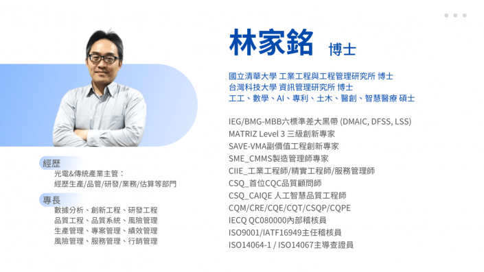 (三)專長:管理系統推動與改善、流程管理與改善、IATF 16949五大工具、管制計畫、PSDM問題分析與決策方法、QC與新QC七大工具、風險評估、品質機能展開(QFD)、二維品質理論、SQM供應商輔導與管理、當責式管理、同步工程、系統性思考、專案管理、長鞭效應(啤酒遊戲)理論、稽核技巧。